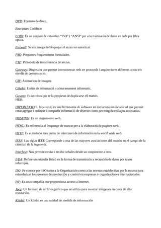 Este documento define y explica brevemente más de 50 términos técnicos relacionados con la informática y las redes, incluyendo formatos de archivos como PDF, AVI y JPEG, protocolos como HTTP, FTP y Bluetooth, componentes de hardware como procesador, memoria y tarjeta gráfica, y conceptos de red como servidor, cliente, LAN, WAN e Internet.