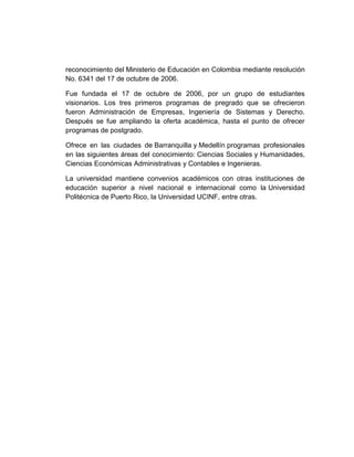 La Corporación Universitaria Americana es una organización educativa fundada en 2006 con la misión de formar personas competentes e integrales mediante la educación y la investigación con enfoque social. Ofrece programas de pregrado y posgrado en áreas como administración, ingeniería, derecho, ciencias sociales y económicas. Cuenta con sedes en Barranquilla y Medellín y mantiene convenios con otras universidades a nivel nacional e internacional.