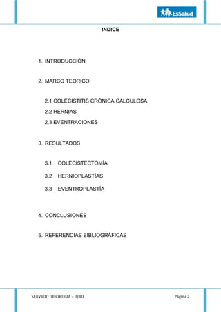 El documento detalla el servicio de cirugía del Hospital Jorge Reátegui Delgado, centrándose en procedimientos como colecistectomías laparoscópicas, hernioplastías y eventroplastías. Se subraya la importancia de un registro detallado de intervenciones para mejorar resultados y minimizar complicaciones. Además, se presenta un estudio estadístico que clasifica las cirugías realizadas y su porcentaje dentro del total de 130 procedimientos.