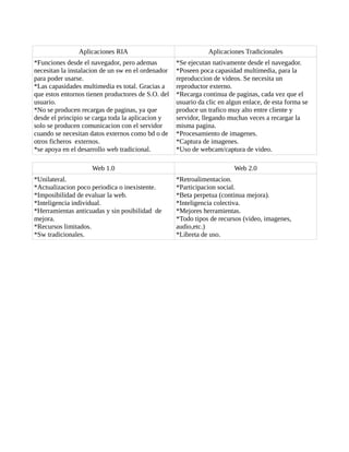 Este documento presenta una comparación entre aplicaciones web tradicionales y aplicaciones web ricas de interfaz (RIA), así como entre las tecnologías Web 1.0 y Web 2.0. Las aplicaciones RIA se ejecutan completamente desde el navegador pero requieren la instalación de software adicional, mientras que las aplicaciones web tradicionales solo se ejecutan desde el navegador. Las RIA tienen mayores capacidades multimedia y no requieren recargas de página, a diferencia de las aplicaciones web tradicionales. La Web 2.0 se caracteriza