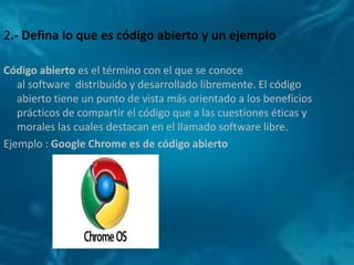 El documento describe los beneficios de Mozilla Firefox, define lo que es código abierto y da un ejemplo, y enumera los beneficios de Google Chrome. Firefox permite marcar, buscar y organizar sitios web fácilmente y cargar páginas más rápido usando menos memoria, con miles de complementos personalizables. Código abierto se refiere a software desarrollado y distribuido libremente, como Google Chrome. Los beneficios de Chrome incluyen buscar rápidamente desde la barra de direcciones, mantener pestañas abiertas sin cerrar el n