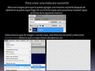 Este documento describe los pasos para crear máscaras vectoriales, imágenes compuestas y panoramas en Photoshop. Para crear una máscara vectorial, se selecciona una capa de imagen y se aplica una máscara vectorial para ocultar la imagen. Luego se dibujan formas sobre la imagen oculta para revelar partes de esta. Para crear una imagen compuesta, se abren dos imágenes en capas y se arrastra una selección de una imagen a la otra. Finalmente, para crear un panorama, se seleccionan varias im