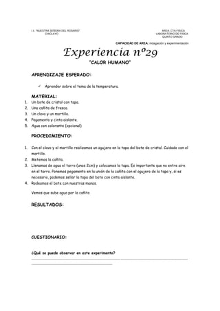 Este documento presenta una serie de 34 experimentos realizados en un laboratorio de física de quinto grado sobre temas relacionados con la temperatura y el calor. Los experimentos incluyen observar cómo sube el agua en un tubo cuando se calienta con las manos, cómo la llama de una vela indica diferencias de temperatura, y cómo se difunde la tinta de forma diferente en agua fría y caliente. Los estudiantes deben realizar los procedimientos descritos y responder preguntas para comprender los conceptos físicos detrás de los resultados