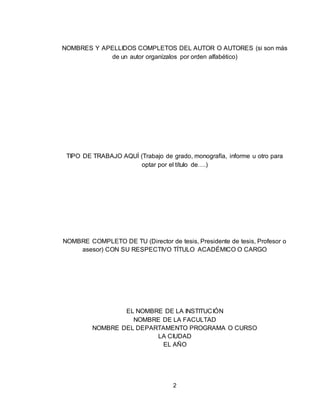 Este documento presenta una plantilla para la elaboración de trabajos académicos siguiendo las normas ICONTEC. Incluye secciones como portada, tabla de contenido, introducción, objetivos, marco teórico, metodología, desarrollo, conclusiones y bibliografía. El propósito es servir de guía para estudiantes en la organización y formato de sus proyectos y tesis.