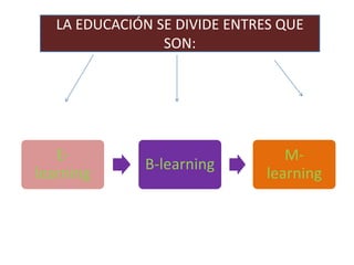 Este documento describe diferentes formas de aprendizaje electrónico (e-learning), móvil (m-learning) e informal apoyado por tecnología. Define e-learning como el aprendizaje que ocurre a través de recursos electrónicos y m-learning como aprendizaje que ocurre mediante el uso de dispositivos móviles. También discute cómo los entornos personales de aprendizaje (PLE) pueden integrar el aprendizaje informal a lo largo de la vida con el aprendizaje formal.