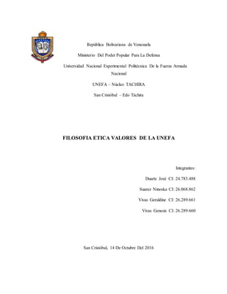 La Universidad Nacional Experimental Politécnica de la Fuerza Armada Nacional (UNEFA) fue creada en Venezuela en 1999 para formar profesionales en ciencia, tecnología e industria para el desarrollo de las Fuerzas Armadas y el país. La UNEFA ha crecido significativamente, abriendo nuevos campus y ampliando su oferta académica para atender a más estudiantes de bajos recursos. Su misión es formar ciudadanos comprometidos con la revolución bolivariana y capaces de apoyar el desarrollo n