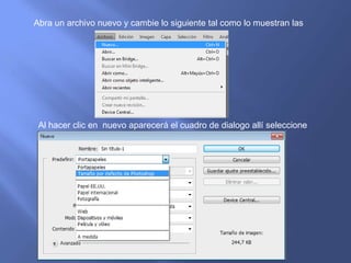 El documento proporciona instrucciones para crear formas, aplicar estilos de capa, seleccionar áreas y realizar ediciones en Photoshop. Instruye sobre cómo dibujar polígonos, cambiar colores de relleno, aplicar trazos a formas, seleccionar áreas usando la varita mágica y crear máscaras vectoriales. También cubre cómo agregar capas de fondo y recortar imágenes.