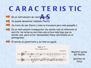 La flauta piccolo es un instrumento de viento madera más pequeño que la flauta travesera, con un sonido agudo y penetrante. Se usa principalmente en bandas militares y en la orquesta sinfónica junto a las flautas, aunque su uso se ha extendido a otras formaciones musicales. Tiene las mismas partes que la flauta travesera y su historia se remonta a instrumentos como el pífano que acompañaban desfiles militares.
