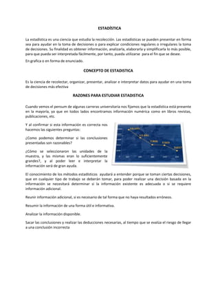 El documento proporciona una introducción a la estadística, incluyendo su definición como la ciencia de recolectar, organizar, presentar, analizar e interpretar datos para ayudar en la toma de decisiones. Explica que existen dos tipos principales de estadística: estadística descriptiva, que resume y presenta datos, y estadística inferencial, que usa muestras para deducir conclusiones sobre poblaciones. También define conceptos clave como población, muestra, y las razones para estudiar estadíst