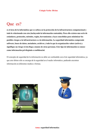 Este documento trata sobre la seguridad informática. Explica que la seguridad informática se enfoca en proteger la infraestructura y la información computacional de amenazas internas y externas mediante estándares, protocolos y herramientas. También describe los objetivos de la seguridad informática como proteger la información, infraestructura y usuarios, y analiza las amenazas, tipos de virus y la importancia de los respaldos de información.