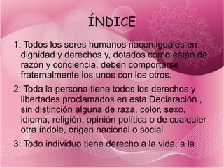 La Declaración de los Derechos Humanos establece que todos los seres humanos nacen libres e iguales en dignidad y derechos, y que cada persona tiene derecho a la vida, la libertad, la seguridad y la no esclavitud, sin distinción de raza, sexo u otros factores.