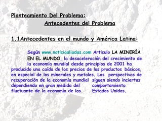 El documento analiza las perspectivas de desarrollo del sector minero en Perú. Detalla que la minería ha sido tradicionalmente importante para la economía peruana y actualmente atrae grandes inversiones extranjeras. Sin embargo, existe percepción negativa hacia la minería que crea inestabilidad. El documento busca determinar las perspectivas del sector considerando factores como la inversión nacional versus extranjera y el equilibrio entre desarrollo económico y protección ambiental.