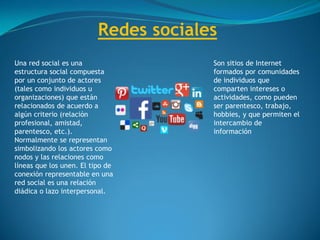 Una red social es una estructura social compuesta por individuos u organizaciones relacionadas entre sí según algún criterio como amistad o trabajo. Normalmente se representan con nodos y líneas que unen los nodos. Son sitios web formados por comunidades que comparten intereses e información.