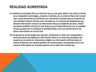 La realidad aumentada permite combinar elementos virtuales con el mundo real en tiempo real a través de dispositivos tecnológicos. Consiste en añadir información virtual a la información física ya existente sin sustituir la realidad. La investigación explora aplicaciones como añadir imágenes generadas por ordenador a videos para ampliar el mundo real, usando pantallas en la cabeza o displays virtuales en la retina. Recientemente, el interés público en la realidad aumentada ha crecido.
