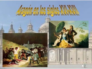 El documento resume la historia del Reino de Aragón bajo el dominio de la Casa de Austria. Los reyes respetaron las leyes de Aragón pero los monarcas de Austria fueron quitando poder gradualmente. El territorio estaba poco poblado con la mayoría de los pueblos teniendo menos de 2000 habitantes. Había más de 60,000 moriscos que fueron convertidos al catolicismo forzosamente. La economía se estabilizó después de las guerras y se benefició del comercio con las Américas.