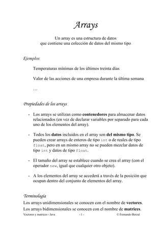 Este documento trata sobre vectores y matrices en Java. Explica cómo declarar, crear y acceder a los elementos de vectores y matrices, así como algunos algoritmos básicos para su manipulación, como sumar los elementos de un vector o mostrar el contenido de una matriz. También introduce conceptos como la copia de arrays y el uso de la biblioteca Arrays de Java.