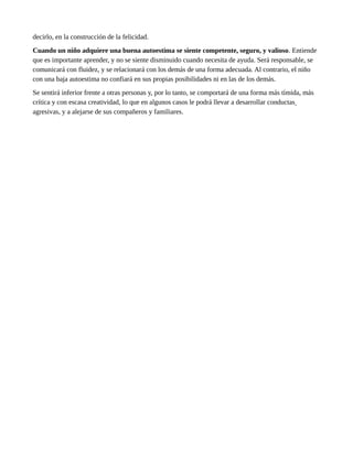 La autoestima es un tema importante en la educación de los niños. La autoestima se refiere a la conciencia de una persona sobre su propio valor y habilidades, y es influenciada por las relaciones con los padres y el ambiente. Una buena autoestima es fundamental para el desarrollo de un niño en el aprendizaje, las relaciones y la felicidad, mientras que una baja autoestima puede conducir a timidez, crítica excesiva y conductas agresivas.