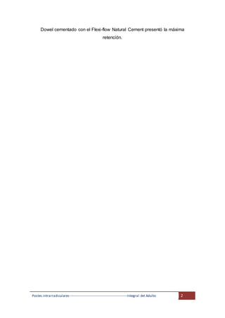 El documento discute la importancia de los postes intrarradiculares en la reconstrucción de dientes tratados endodónticamente, señalando que su principal función es proporcionar retención para coronas y puentes, no reforzar el diente. La elección del diseño y material del poste, así como los factores como la adaptación, inclinación y diámetro afectan la retención y el riesgo de fracturas radiculares. Además, se enfatiza la necesidad de preservar estructura dental y elegir el material adecuado para minimizar tensiones que puedan llevar a fracturas.