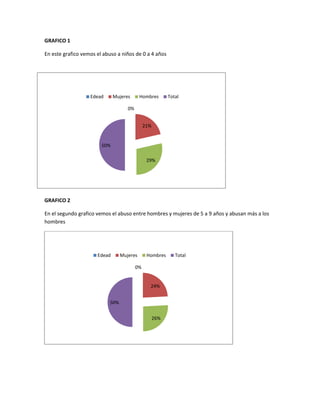 Este documento presenta 6 gráficos que analizan los datos sobre el abuso contra niños y niñas de diferentes grupos de edad. La tabla muestra el número de casos de abuso reportados entre mujeres y hombres de 0-4 años, 5-9 años, 10-14 años y 15-17 años, así como casos sin información de edad. Los gráficos representan visualmente estos datos y comparan el abuso entre géneros para cada grupo de edad. El gráfico final es una barra horizontal que resume el total de casos de abuso reportados para mujeres y hombres por edad