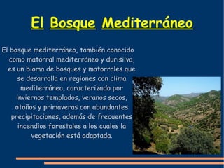 El bosque mediterráneo se caracteriza por inviernos templados, veranos secos y frecuentes incendios forestales. La vegetación es xerófila y se ha adaptado a la aridez estival y los incendios, y árboles como el alcornoque y la encina son resistentes al fuego. El bosque mediterráneo alberga especies endémicas como el lince ibérico, el águila imperial ibérica, el alcornoque, la encina, el brezo y el madroño.