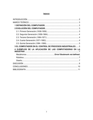 Este documento describe la evolución del computador a través de cinco generaciones desde 1938 hasta 1999, así como su aplicación en el control de procesos industriales. Explica que las primeras generaciones utilizaban tubos de vacío y transistores, mientras que las generaciones posteriores incorporaron circuitos integrados y microprocesadores. También destaca algunos ejemplos tempranos del uso de computadoras en la industria petrolera y química para el control de procesos, y cómo su aplicación se ha extendido a áreas como la mecatrónica, robótica