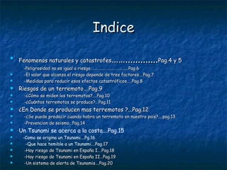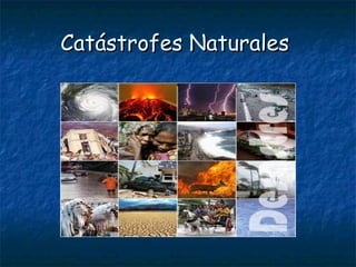 Este documento trata sobre los diferentes tipos de catástrofes naturales como terremotos, tsunamis, erupciones volcánicas e inundaciones. Explica cómo se miden y producen los terremotos, dónde ocurren con más frecuencia, y los métodos para predecirlos y reducir sus efectos. También analiza los riesgos asociados a cada fenómeno natural y las medidas de prevención.