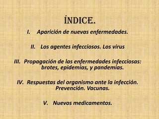 Este documento presenta información sobre enfermedades infecciosas en 6 secciones. Detalla la aparición de nuevas enfermedades y enfermedades reemergentes, los agentes infecciosos como virus y bacterias, la propagación de enfermedades a través de brotes, epidemias y pandemias, las respuestas del organismo a las infecciones y la prevención a través de vacunas, y nuevos medicamentos para tratar infecciones. El documento también analiza grandes epidemias del pasado como la peste negra y pandemias rec