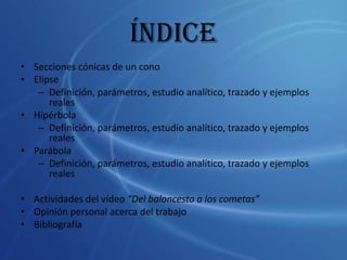 Este documento presenta información sobre las secciones cónicas (elipse, hipérbola y parábola). Define cada curva, explica sus parámetros clave como ejes, focos y excentricidad, y métodos para trazarlas. También proporciona ejemplos de cómo se usan estas curvas en aplicaciones como órbitas planetarias, telescopios, relojes solares y navegación.