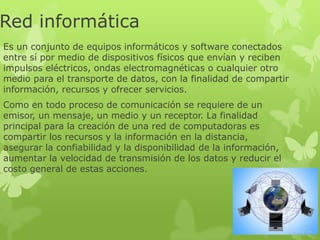 Una red informática conecta equipos informáticos y software a través de dispositivos físicos que comparten información y recursos. Las redes tienen emisores, receptores y medios de transmisión de datos con el objetivo de compartir información de manera fiable y disponible a una velocidad aumentada y bajo costo.