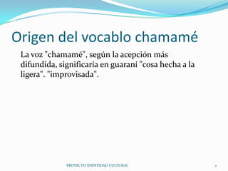 El documento aborda el chamamé, una danza folclórica argentina de origen guaraní, caracterizada por su ritmo alegre y su evolución a través de diversas influencias culturales. Describe aspectos esenciales como su historia, vestimenta tradicional y coreografía, destacando la importancia de la sincronización entre los bailarines. Los hombres y mujeres presentan atuendos característicos que reflejan la identidad cultural de la región.