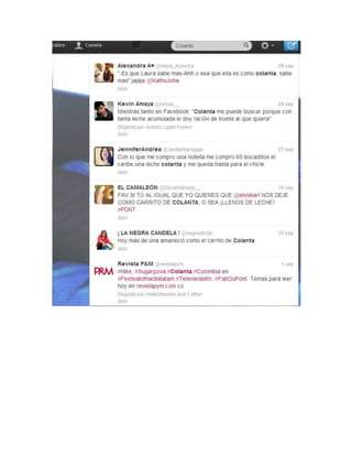 El documento presenta la historia de Colanta, una cooperativa lechera colombiana fundada en 1964 por pequeños productores de leche en Antioquia. Inicialmente llamada Coolechera, cambió su nombre a COLANTA en 1973 y comenzó a expandirse. Actualmente, COLANTA es la empresa láctea más grande de Colombia, con más de 10.000 asociados productores y 4.500 empleados asociados. El documento también describe los diversos productos lácteos, refrescos, cereales y vinos que COLANTA produce y exporta.