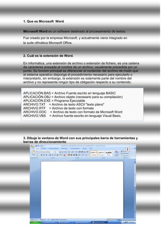 1. Que esMicrosoft Word<br />Microsoft Word es un software destinado al procesamiento de textos.<br />Fue creado por la empresa Microsoft, y actualmente viene integrado en la suite ofimática Microsoft Office.<br />2. Cuál es la extensión de Word.<br />En informática, una extensión de archivo o extensión de fichero, es una cadena de caracteres anexada al nombre de un archivo, usualmente precedida por un punto. Su función principal es diferenciar el contenido del archivo de modo que el sistema operativo disponga el procedimiento necesario para ejecutarlo o interpretarlo, sin embargo, la extensión es solamente parte del nombre del archivo y no representa ningún tipo de obligación respecto a su contenido.<br />APLICACIÓN.BAS = Archivo Fuente escrito en lenguaje BASIC<br />APLICACIÓN.OBJ = Archivo objeto (necesario para su compilación)<br />APLICACIÓN.EXE = Programa Ejecutable<br />ARCHIVO.TXT = Archivo de texto ASCII \"
