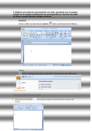 <br />ARCHIVO.RTF = Archivo de texto con formato<br />ARCHIVO.DOC = Archivo de texto con formato de Microsoft Word<br />ARCHIVO.VBS = Archivo fuente escrito en lenguaje Visual Basic.<br />3. Dibuje la ventana de Word con sus principales barra de herramientas y barras de direccionamiento<br />30099033020<br />4. Elabore una carta de comunicación con todo, guardarla con el nombre carata1 en la carpeta combinación de correspondencia. Nombre del taller de Word, carpeta llamada trabajos de Word.<br />NUEVO <br />Crear y editar un documento nuevo Abre un documento en blanco.<br />64389049530<br />Abrir<br /> Abre un diálogo para que pueda abrir el documento que seleccione.<br />22542526670<br />Cerrar Word<br />Para cerrar Word siga estos pasos.<br />Haga clic en el botón en la parte superior derecha de la ventana de Word.<br />15240-1270<br />Guardar<br /> Abre el diálogo, Archivo | Guardar como si se trata de un archivo nuevo. De lo contrario, guarda el archivo en el disco. Usted deberá elegir el nombre y la carpeta, para guardar dentro de ella, para los archivos nuevos.<br />64389161595<br />Vista preliminar<br />Muestra como se verá la página cuando se imprima.<br />472440-3810<br />Encabezado y pie de pagina <br />Es el área reservada para texto en la parte superior que va a aparecer en cada página del documento. Usado con frecuencia para insertar número de página, títulos de la sección, títulos del documento y nombre del autor<br />200596538735 <br />Comentario<br /> Es el que no hace Word antes de iniciar un documento nuevo<br />Imprimir<br />1358265564515 Este botón de Word imprime todo el documento. En algunas otras aplicaciones un botón de Imprimir suele abrir el diálogo de impresión.<br /> Intervalo de páginas. En este recuadro indicamos las páginas que queremos imprimir, basta con pinchar en la opción deseada:<br />Páginas. Permite indicar qué páginas queremos que nos imprima. Si queremos páginas salteadas, poner los números de página separados por coma, por ejemplo: 2,8,10 imprimiría las páginas 2, 8 y 10 Para indicar un intervalo, poner la página inicial y la página final separadas por un guión, por ejemplo: 4-7 imprimiría las páginas 4,5,6 y 7. Se puede indicar un intervalo sin página inicial para indicar 'hasta', por ejemplo: -3 imprimiría las paginas 1,2 y 3 (hasta la página 3); o bien sin página final para indicar 'desde', por ejemplo 12- imprimiría las páginas desde la página 12 hasta la última ambas inclusive. También podemos combinar cualquiera de las formas anteriores, por ejemplo: 2,3,10- imprimiría las páginas 2,3,10,11...hasta la última.<br />Copiar<br />1358265619760 El botón Copiar coloca una copia del material que se haya seleccionado, en el portapapeles de Windows, donde queda disponible para pegarlo en otra parte.comando= control+c<br />Pegar<br /> Pone el contenido del portapapeles de Windows, en la posición en que se encuentra el cursor. Comando control+v <br />103441520320<br />Deshacer<br />Revierte la última acción. Word guarda una lista de todos los Deshacer que hizo, que pueden llegar a quedar en la memoria hasta completar 100 ítems. Control +z<br />136779043815<br />Rehacer<br />Ejecutar una acción que acaba de ser deshecha. Control+y<br />Seleccionar todo<br />1522627810586Si un texto u objeto es seleccionado, su próximo tecleado se aplicará a los mismos. Seleccione un objeto dibujado mediante clic sobre el mismo. Seleccione una caja de texto mediante clic en su borde. Seleccione texto, arrastrando a través del mismo. Control +e<br />Buscar<br />Un diálogo que le permite buscar una palabra, frase o formato particular.<br />Buscar y Reemplazar<br />Un diálogo que le permite buscar palabras, o frases particulares y reemplazarlas con alguna otra cosa.<br />472440140335<br />Diseño de impresión<br />1329690276860Nos muestra como va quedar impreso el documento que estamos realizando<br />Zoom<br /> Control en la Barra de Herramientas Estándar, que amplía o reduce el tamaño de la vista de un documento <br />6286543180277749013970<br />Salto de página<br />Fuerza al texto que sigue a empezar en una nueva página.<br />Salto de página blando<br />Inicia el texto en la próxima página del documento por la justificación del mismo. Si se agrega o borra texto, la ubicación del corte de página blando puede cambiar.<br />Salto de página duro<br />Un salto de página que se producirá sin tener en cuenta la justificación del texto. Se inserta con CTRL + ENTRAR. En el diálogo Insertar | Salto es denominado Página Siguiente dentro de tipo de Salto de Sección.<br />Salto de página siguiente<br />1101090477520Fuerza al texto siguiente a empezar en la parte superior de la página próxima. También se lo conoce como corte duro de página<br />Numero de pagina (encabezado y pie de pagina)<br />Es el área reservada para texto en la parte superior que va a aparecer en cada página del documento. Usado con frecuencia para insertar número de página, títulos de la sección, títulos del documento y nombre del autor.<br />967740-3175<br />Símbolo<br />2386965531494Para insertar un símbolo. Vaya a la opción Insertar, localice y haga un clic en Símbolo. Al hacer eso, Word mostrará una pequeña lista con los caracteres más comunes. Para entrar al cuadro que muestra todos los caracteres, haga un clic en Más símbolos. <br />Fecha y Hora<br />Diálogo: Una caja de diálogo de Windows Propiedades de Fecha y Hora, que le permite ajustar la hora y la fecha;Menú: Un Comando del menú Insertar que permite poner la fecha y hora dentro de un documentoBotón: en la barra de herramientas Ver | Encabezado y pie de Página que le permite insertar la fecha ido la hora.<br />1510665-3175<br />Imagen, prediseñada gif animados<br />Una imagen ubicada en la misma línea que el texto.<br />47180599060<br />Organigrama<br /> <br />Un organigrama representa gráficamente la estructura administrativa de una organizació