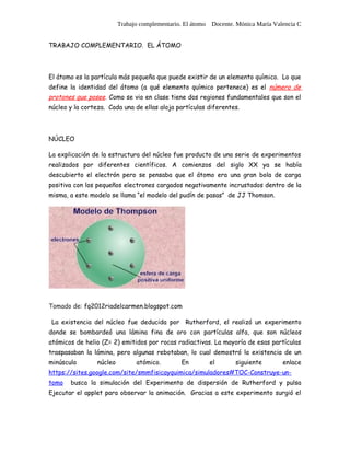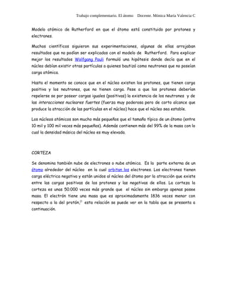 El documento describe la estructura del átomo, incluyendo el núcleo y la corteza. Explica que el núcleo contiene protones y neutrones y fue descubierto por Rutherford en su experimento de dispersión de partículas alfa. La corteza contiene los electrones que orbitan alrededor del núcleo. También define conceptos clave como el número atómico, la masa atómica y los isótopos.
