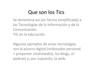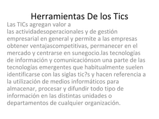 Este documento define y explica varios tipos de tecnologías de la información y la comunicación (TIC), incluyendo herramientas colaborativas en línea como Google Docs, blogs, SlideShare y suites ofimáticas. También describe cómo estas herramientas pueden usarse para compartir información y trabajar en grupo de forma remota.