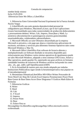 Este documento compara las suites ofimáticas LibreOffice y Microsoft Office. LibreOffice es una suite de código abierto gratuita disponible para varios sistemas operativos, mientras que Microsoft Office es privativo y solo funciona en Windows. Algunas de las principales diferencias son que LibreOffice tiene 6 aplicaciones mientras que Microsoft Office está diseñado exclusivamente para Windows. LibreOffice usa formatos abiertos como OpenDocument mientras que Microsoft Office usa formatos propietarios como .doc.