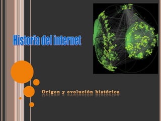 La historia del internet comenzó en 1969 con la creación de ARPANET por el Departamento de Defensa de EE.UU. para conectar computadoras de universidades e instituciones gubernamentales. En los años 80, surgieron otras redes como CSNET y MILNET que utilizaron los protocolos TCP/IP, interconectándose todas para formar la red de redes llamada Internet. En 1986, la red NSFnet se convirtió en la espina dorsal de Internet al facilitar el acceso a centros de supercomputación para la comunidad científica estadounidense.