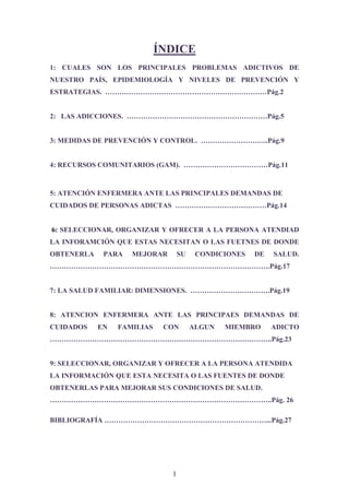 Este documento presenta un informe sobre las adicciones en España. Detalla los principales problemas de adicción como el alcohol, el tabaco y las drogas ilegales como el cannabis y la cocaína. Explica la epidemiología de estos problemas de adicción y los niveles de prevención. También describe las adicciones químicas y no químicas, el alcoholismo como una enfermedad prevalente, y los factores de riesgo para desarrollar adicción al alcohol.