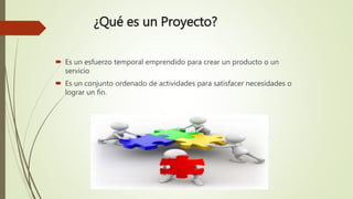El documento describe qué es un proyecto y el trabajo comunitario. Define un proyecto como un esfuerzo temporal para crear un producto o servicio, y el trabajo comunitario como un servicio donado para beneficiar al público. Explica que los proyectos comunitarios son importantes para renovar y resolver necesidades, y enumera algunos beneficios como la participación, el empleo y el bienestar social, así como limitaciones como los recursos y el presupuesto.