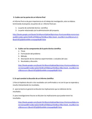 Los documentos describen los componentes de los informes de avance e informes finales de investigación. Un informe de avance incluye la metodología, objetivos, resultados esperados y cronograma. Un informe final contiene una sección técnico-científica con el título, problema, método, resultados y discusión, y una sección administrativa con cubierta, introducción y conclusiones. La discusión de un informe analiza si los resultados confirman o no las hipótesis y sus implicaciones.
