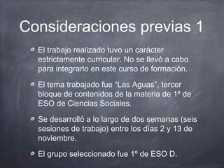 El documento describe un proyecto en el que los estudiantes de 1o ESO D usaron miniportátiles para investigar y presentar contenidos sobre el tema de "Las Aguas". Los estudiantes trabajaron en grupos para tres apartados (ríos, mares, otras variantes) usando los miniportátiles para buscar información e imágenes y crear presentaciones. El proyecto resultó en una mayor motivación de los estudiantes y demostró su competencia digital.