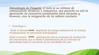 Este documento describe la metodología de proyectos utilizada en el Colegio Santa Teresita de Lisieux. La metodología de proyectos permite que los alumnos participen activamente en el proceso de aprendizaje al elegir los temas que quieren estudiar y definir los objetivos y metas de los proyectos. El maestro guía a los alumnos pero los deja tomar la iniciativa. Los proyectos pueden durar varias semanas e implican flexibilidad, integración de conceptos, vinculación con otras personas y salir del aula.