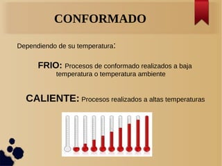 El conformado consiste en obtener piezas de metal mediante corte y deformación mientras se moldea la forma deseada, teniendo en cuenta la temperatura y tipo de proceso. Los principales tipos de conformado son la forja y estampación, laminación, extrusión, troquelado, cizallado y doblado.