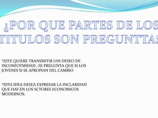 El documento discute temas relacionados con la juventud y la economía. Menciona que los jóvenes enfrentan altas tasas de desempleo y embarazo a temprana edad. También señala que sectores como la industria creativa están creciendo rápidamente y pueden contribuir a una economía mundial más fuerte si los gobiernos invierten en la educación de los jóvenes.