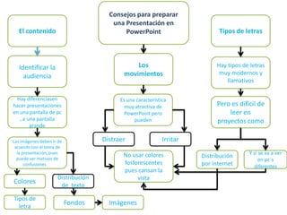 Este documento ofrece consejos para preparar una presentación en PowerPoint, incluyendo identificar la audiencia, usar imágenes y colores apropiados, seleccionar tipos de letra legibles, y considerar cómo y dónde se presentará la presentación. Recomienda identificar la audiencia, usar imágenes que se relacionen con el tema, evitar colores brillantes que puedan cansar la vista, y seleccionar tipos de letra fáciles de leer tanto en pantallas grandes como pequeñas.