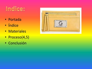 El documento proporciona instrucciones para hacer una billetera de cuero. Explica los materiales necesarios (tijeras, cuero fino, máquina de coser) y el proceso que incluye cortar las piezas, superponerlas de mayor a menor y coserlas juntas en el orden correcto para formar la estructura de la billetera.