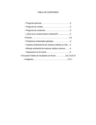 El documento aborda la contaminación ambiental en Santiago de Cali, destacando el mal manejo de residuos sólidos como una de sus principales causas. Se enfatiza la importancia de crear conciencia sobre la gestión de residuos para mitigar impactos negativos en el medio ambiente y la salud pública. Además, se presentan encuestas que reflejan la percepción de la ciudadanía sobre la responsabilidad en la contaminación y la efectividad de las empresas de aseo.