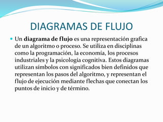 El documento presenta un diagrama de flujo para describir un proceso. Explica que un diagrama de flujo utiliza símbolos para representar los pasos de un algoritmo o proceso mediante flechas que muestran el orden de ejecución. Luego detalla los pasos para construir un diagrama de flujo, que incluyen establecer el alcance del proceso, identificar las actividades y su orden, agregar puntos de decisión, y asignar símbolos para completar el diagrama. Finalmente, menciona algunos tipos comunes de diagramas