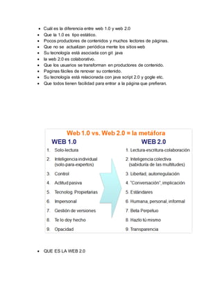 Este documento compara la Web 1.0 y la Web 2.0, describiendo que la Web 1.0 es estática con pocos productores de contenido, mientras que la Web 2.0 es colaborativa con usuarios que producen contenido. Explica herramientas comunes de la Web 2.0 como wikis, blogs, redes sociales y sitios como Flickr, YouTube y SlideShare. También describe las funciones de Google Sites, Google Alerts y Google Docs.