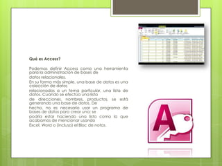 Access es una herramienta para la administración de bases de datos relacionales que permite almacenar, buscar, analizar e imprimir datos de forma organizada. Una base de datos en Access contiene tablas con campos y registros, consultas para extraer información, formularios para gestionar datos, informes para imprimirlos y macros y módulos para automatizar tareas.